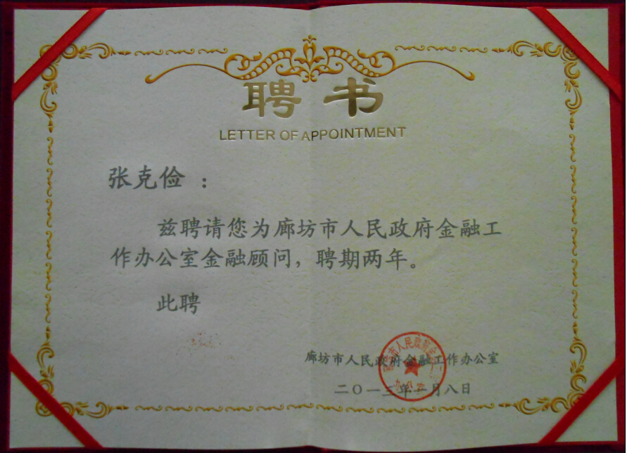 安次區(qū)工商局聘書 張克儉被選舉為中稅協(xié)理事 廊坊市金融辦金融顧問聘書