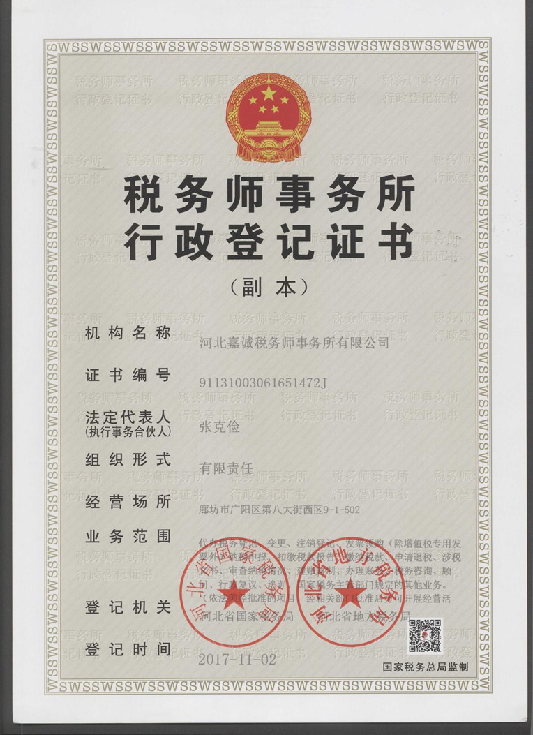 河北嘉誠稅務師事務所執(zhí)業(yè)證書 -