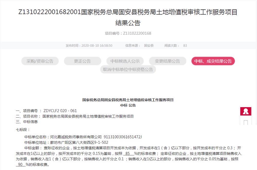 【關(guān)于我們】河北嘉誠稅務(wù)師事務(wù)所有限公司中標(biāo)固安縣稅務(wù)局土地