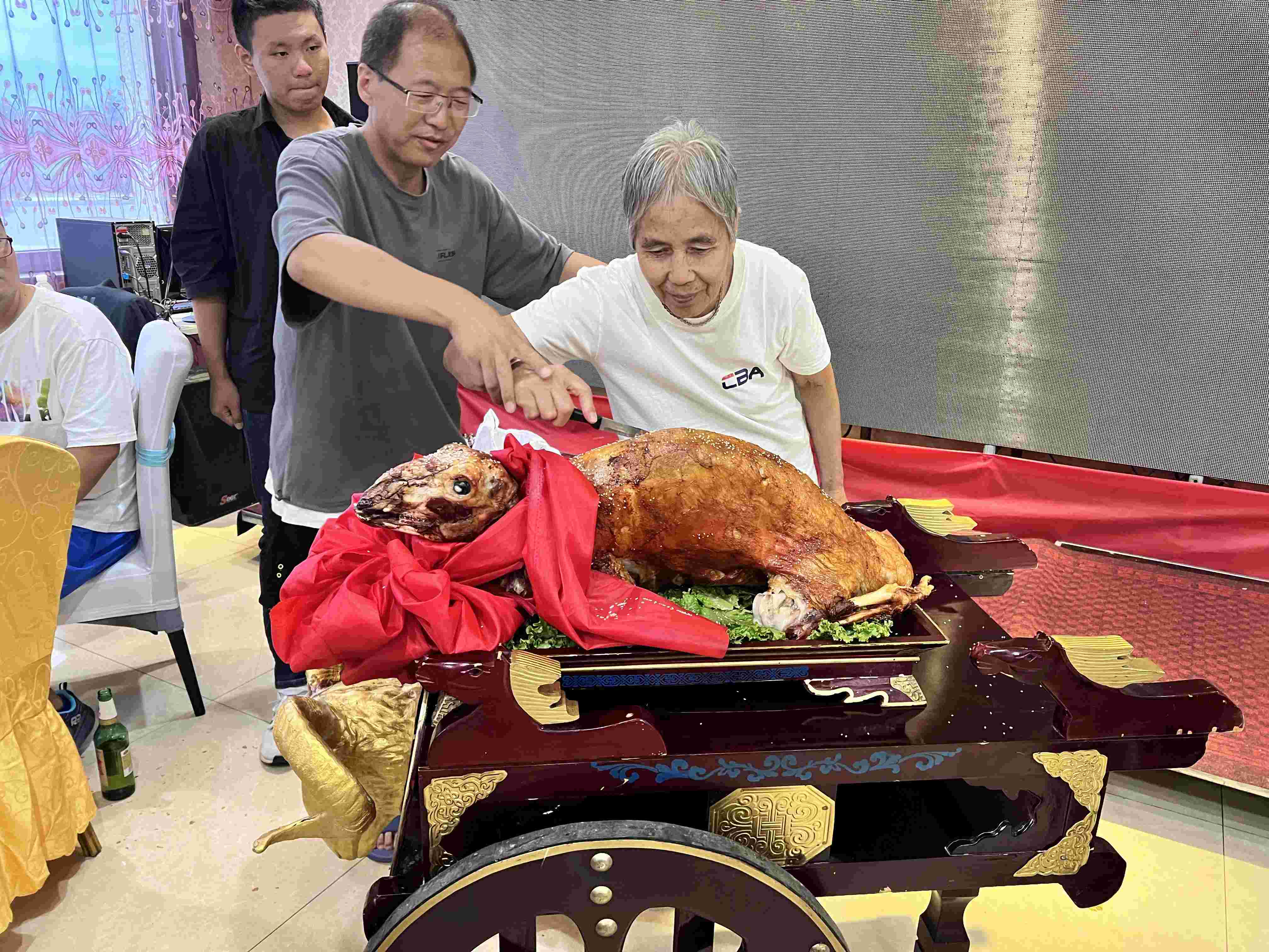 晚上全團聚餐,我們邀請團隊年齡最長者、也是我們最尊敬的秦偉霞老人進行烤全羊開羊儀式。