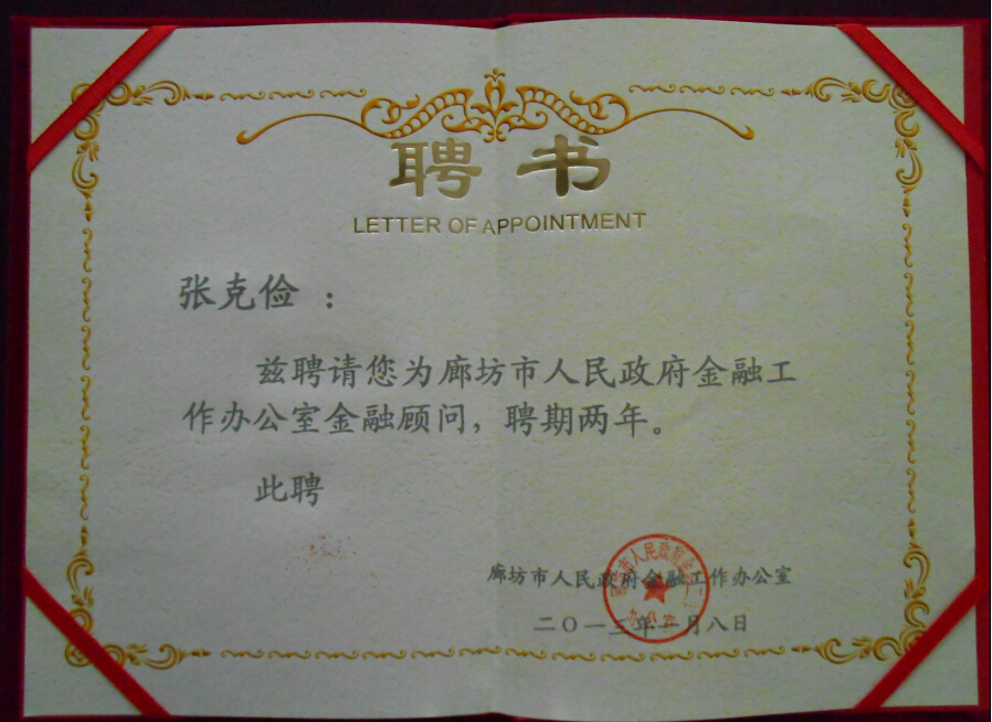 張克儉董事長(zhǎng)被廊坊市政府金融工作辦公室聘請(qǐng)為顧問