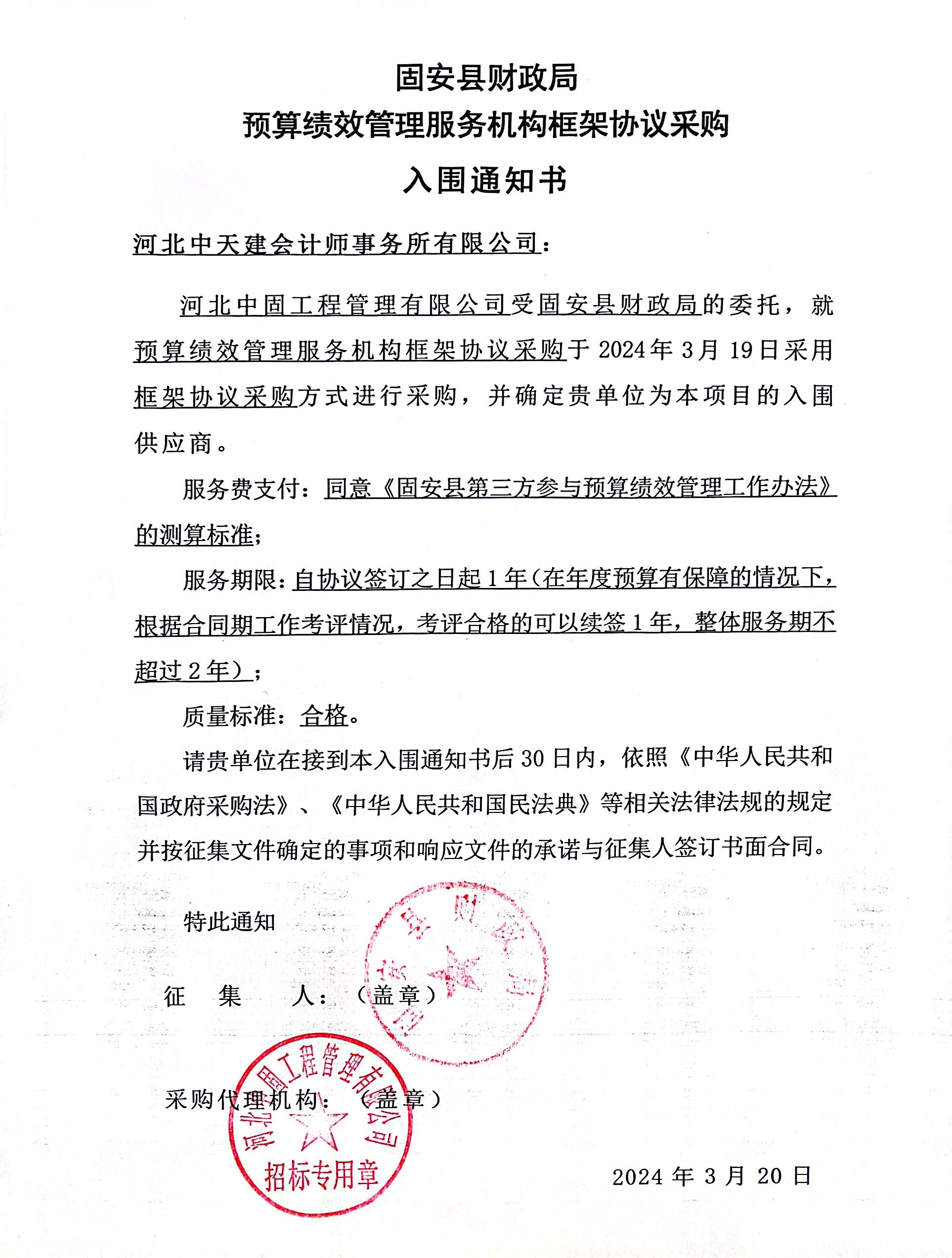 2024年3月20日,河北中天建會計師事務所有限公司砥礪奮進,再添佳績,順利中標固安縣財政局預算績效管理服務機構(gòu)框架協(xié)議采購項目。