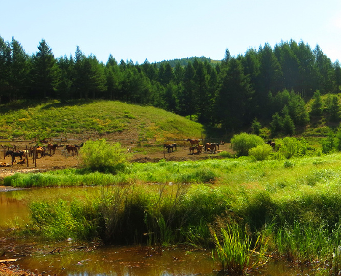這是一汪凈水,四周群山環(huán)繞,草木蔥蘢,茂密的松杉伴著翠綠的草場一起擁抱著碧水,更使神龍?zhí)兑叭M生。置身于清澈見底的湖邊,漫步在棧橋連接的北岸,眺望漫山的林海和湖畔的濕地,只見樹林山巒與湖水交相輝映,風光旖旎,仿佛置身世外,令人有一絲超凡脫俗的感覺。